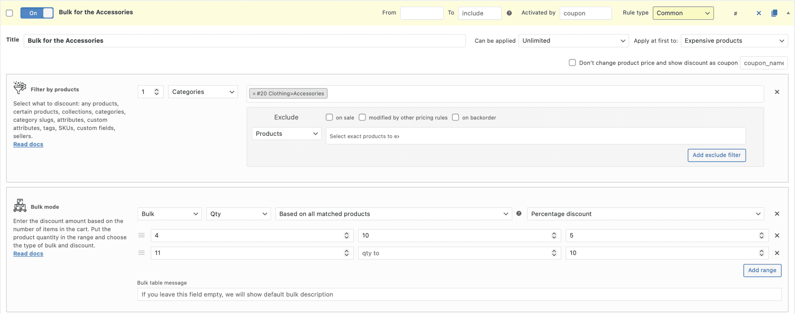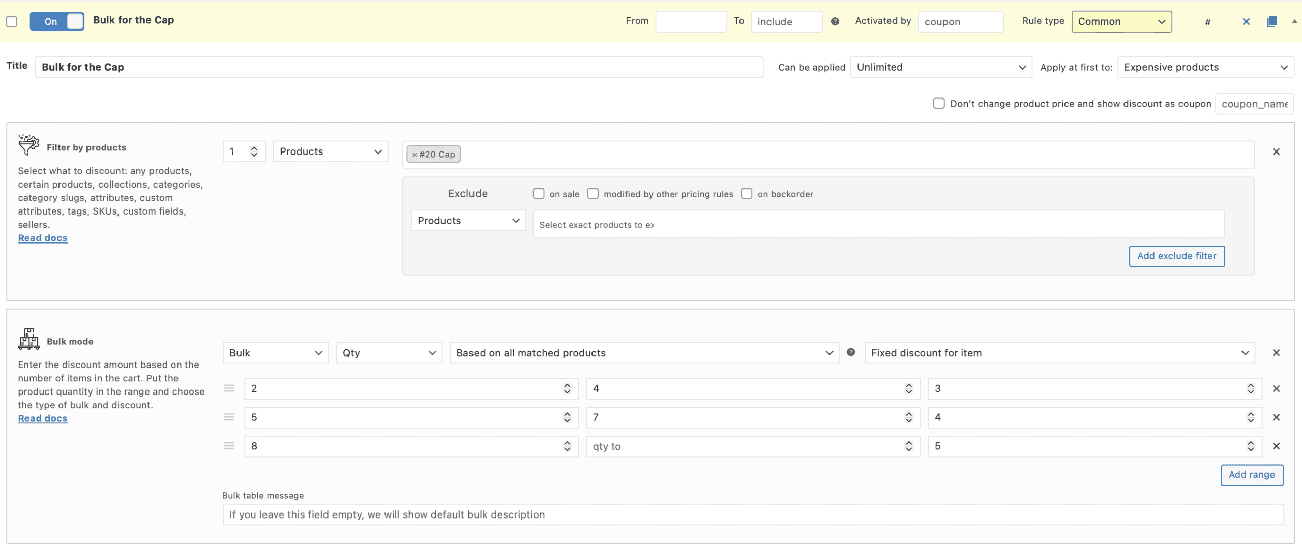 It’s easy to create the bulk rule for the product choosing “Bulk” rule’s template and adding the bulk ranges