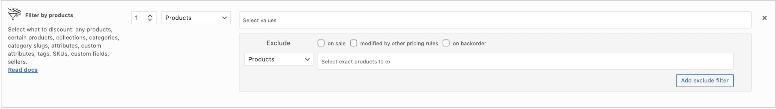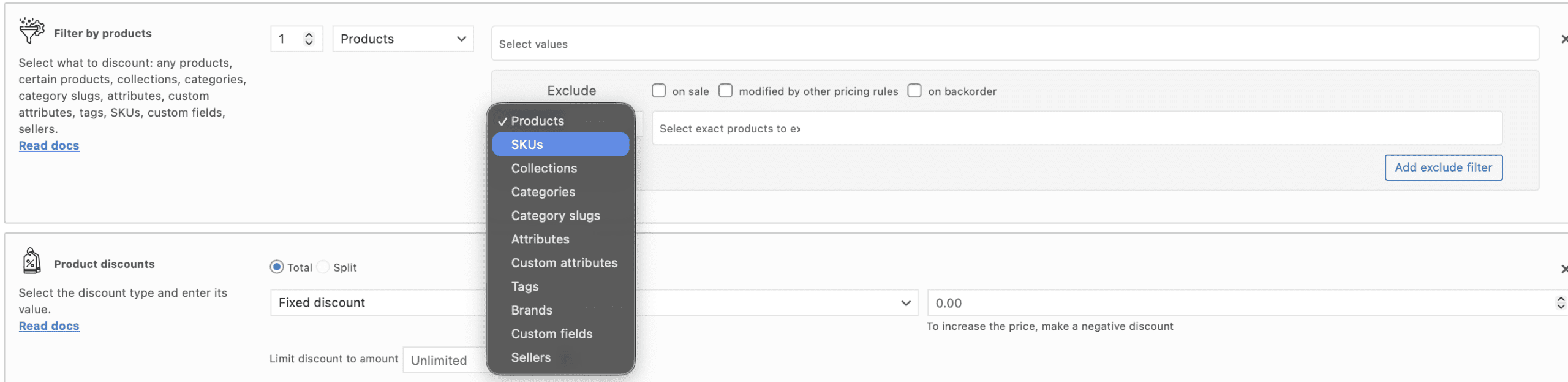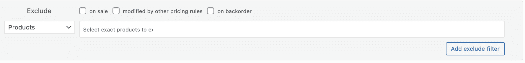 Exclude products that wouldn’t be discounted: enter the values into the field “Exclude products” or turn on one of the checkboxes: