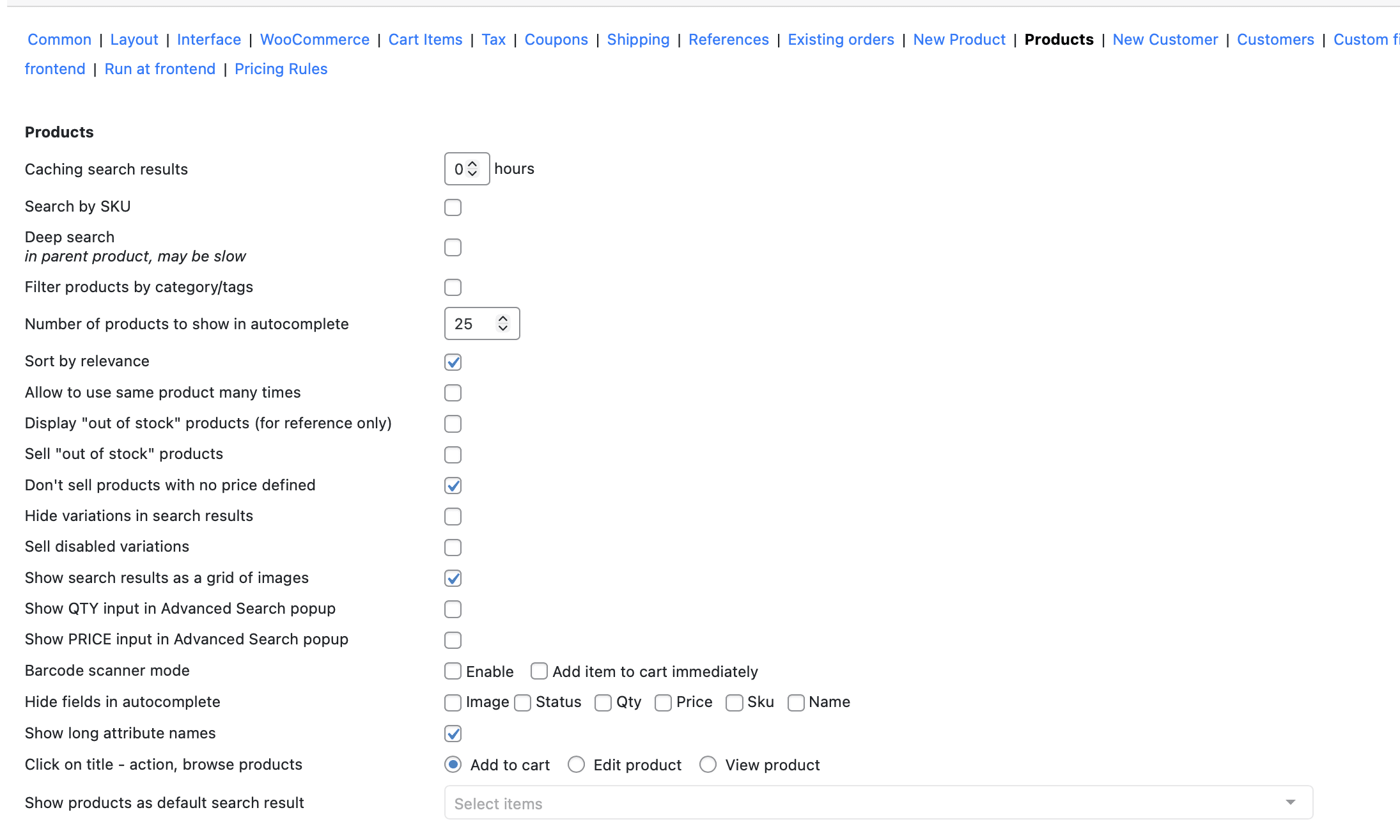 Click on title – action, browse product. Choose the action after clicking a product in search result: add to cart, edit product, view product.