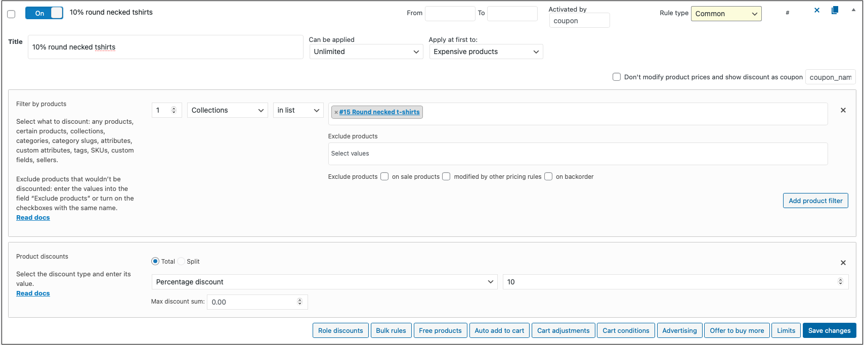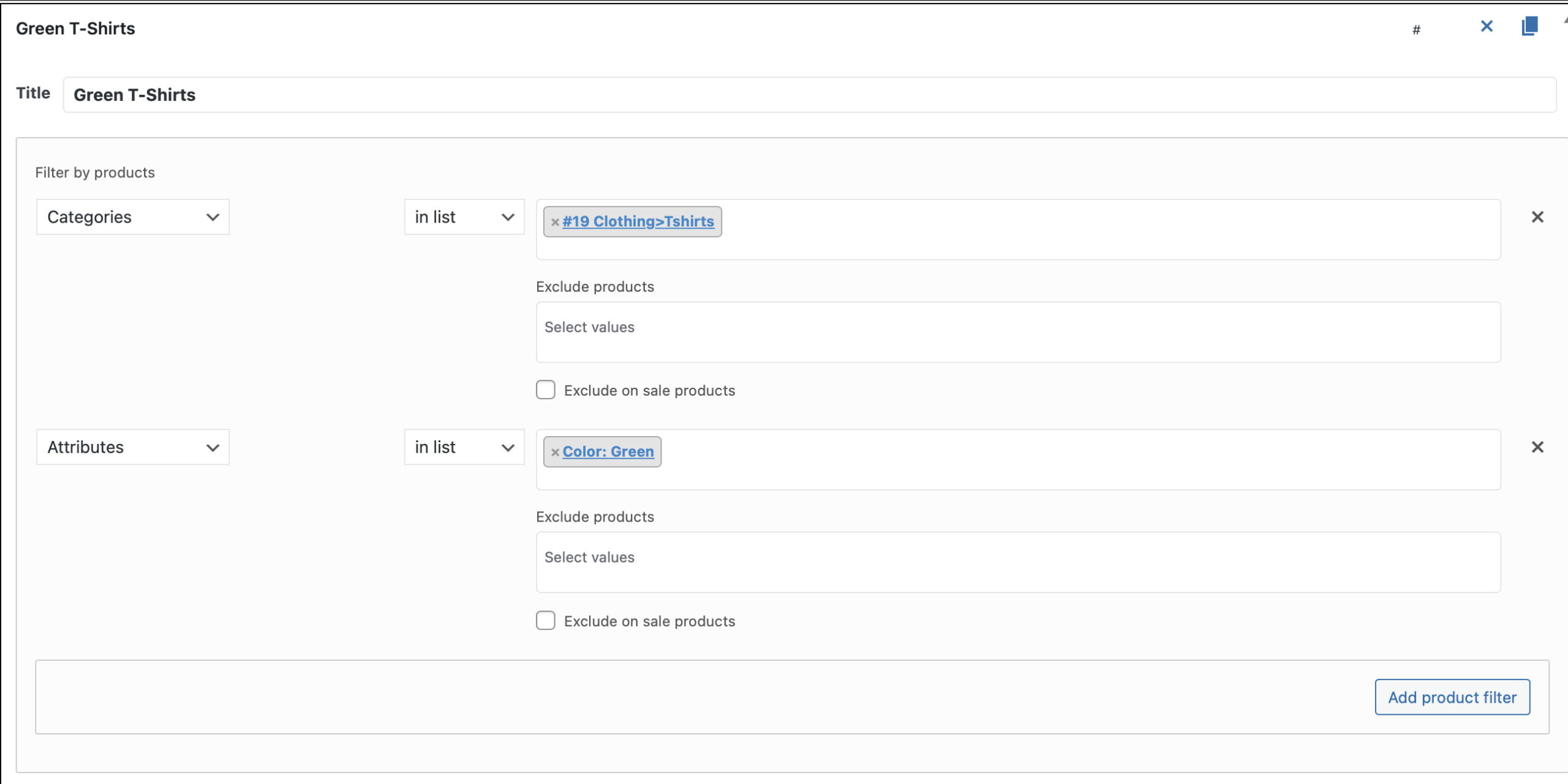 The frequent situation for using Product Collection is product belonging to 2 category at the same time. For example, you want to get a 10% discount to the t-shirts with a round neck, where there are 2 categories: “T-Shirt” and “Round neck”. Let’s create a product collection for this case. Add a filter “Category”>”T-Shirt” and another one filter “Category”>”Round Neck”.