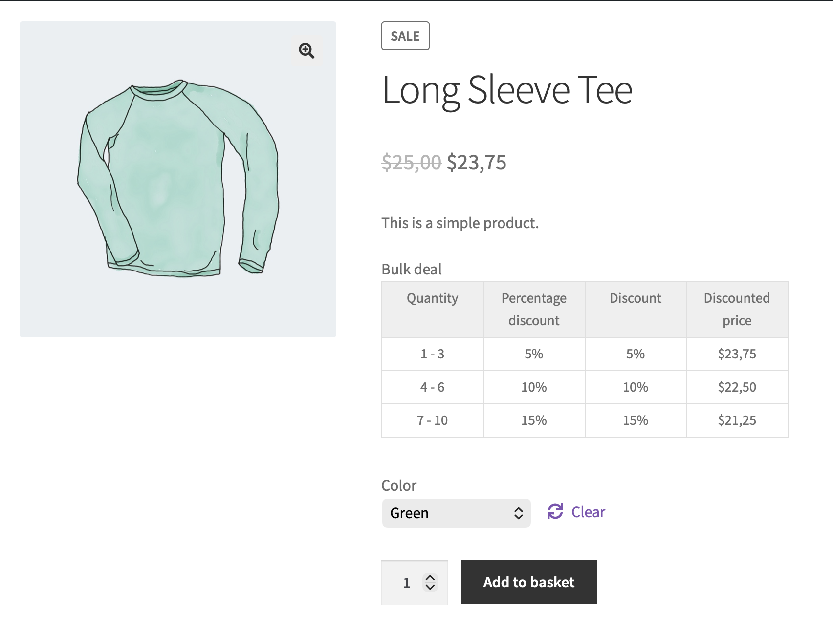 Look at the product page of the T-Shirt. Here’s a bulk table and the discounted price for the green one: