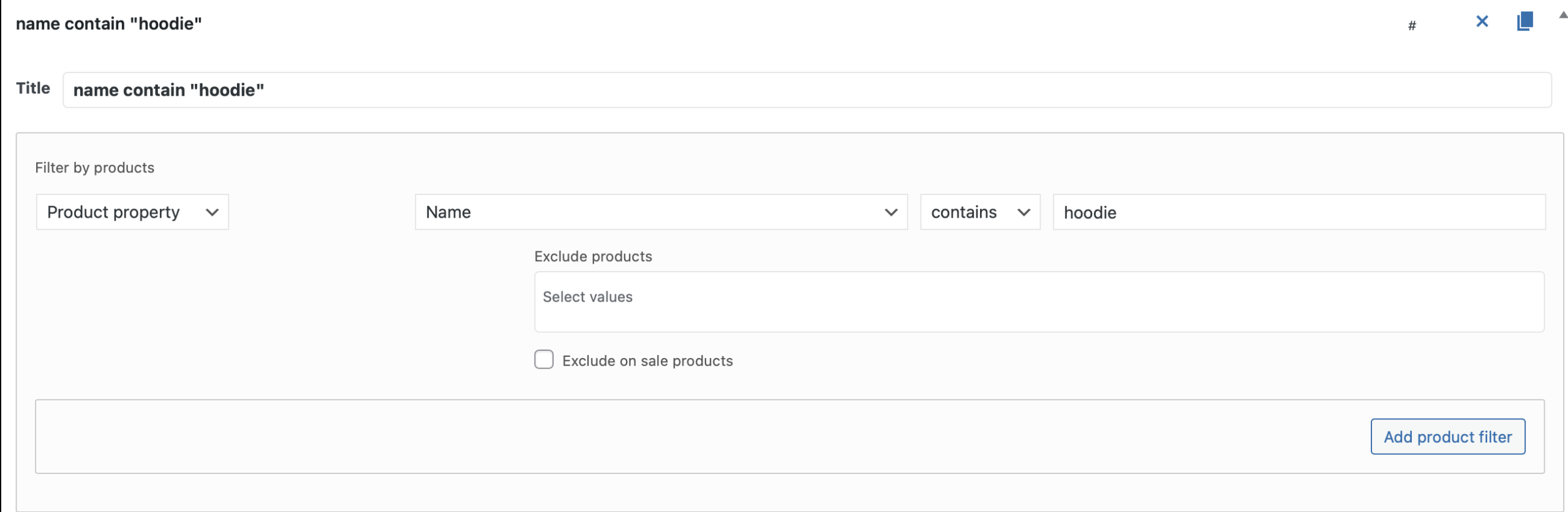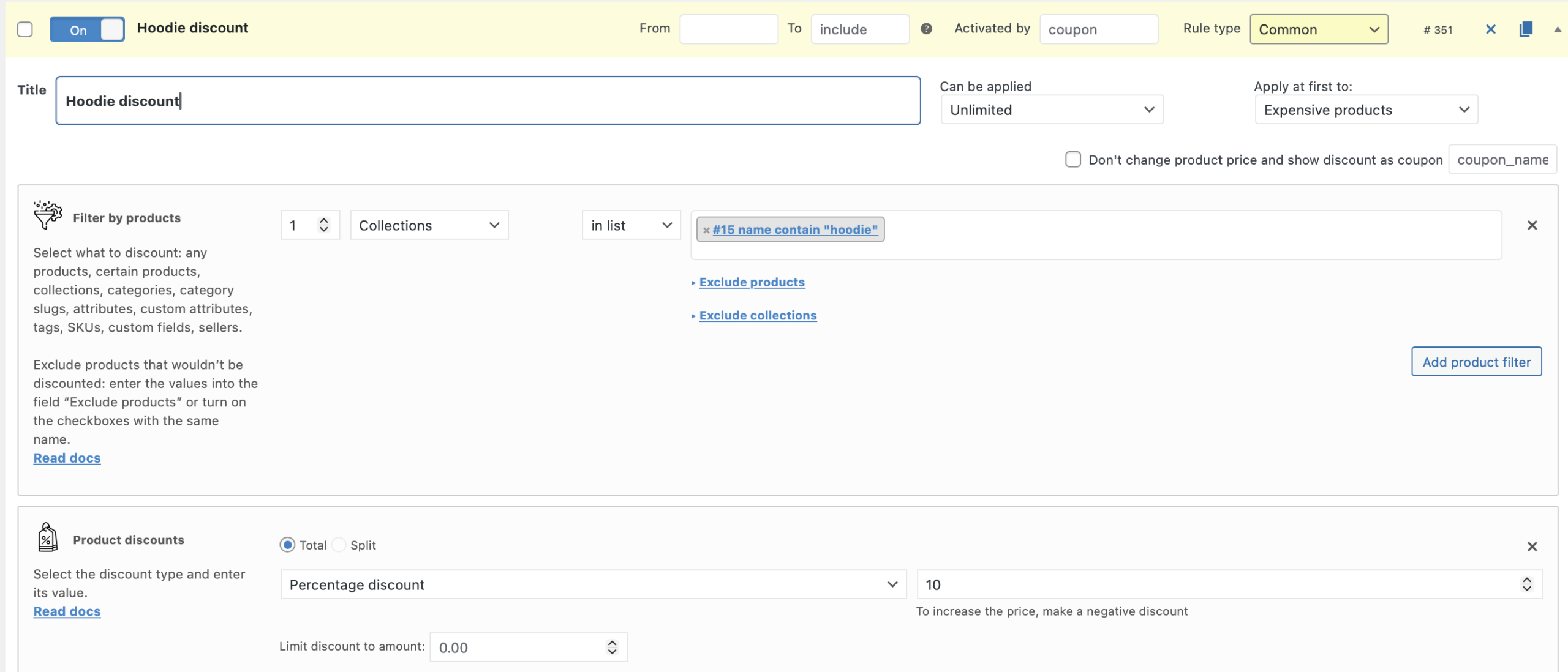 Let’s create the collection and the simple percentage discount rule for all the products with the “hoodie” in the name.