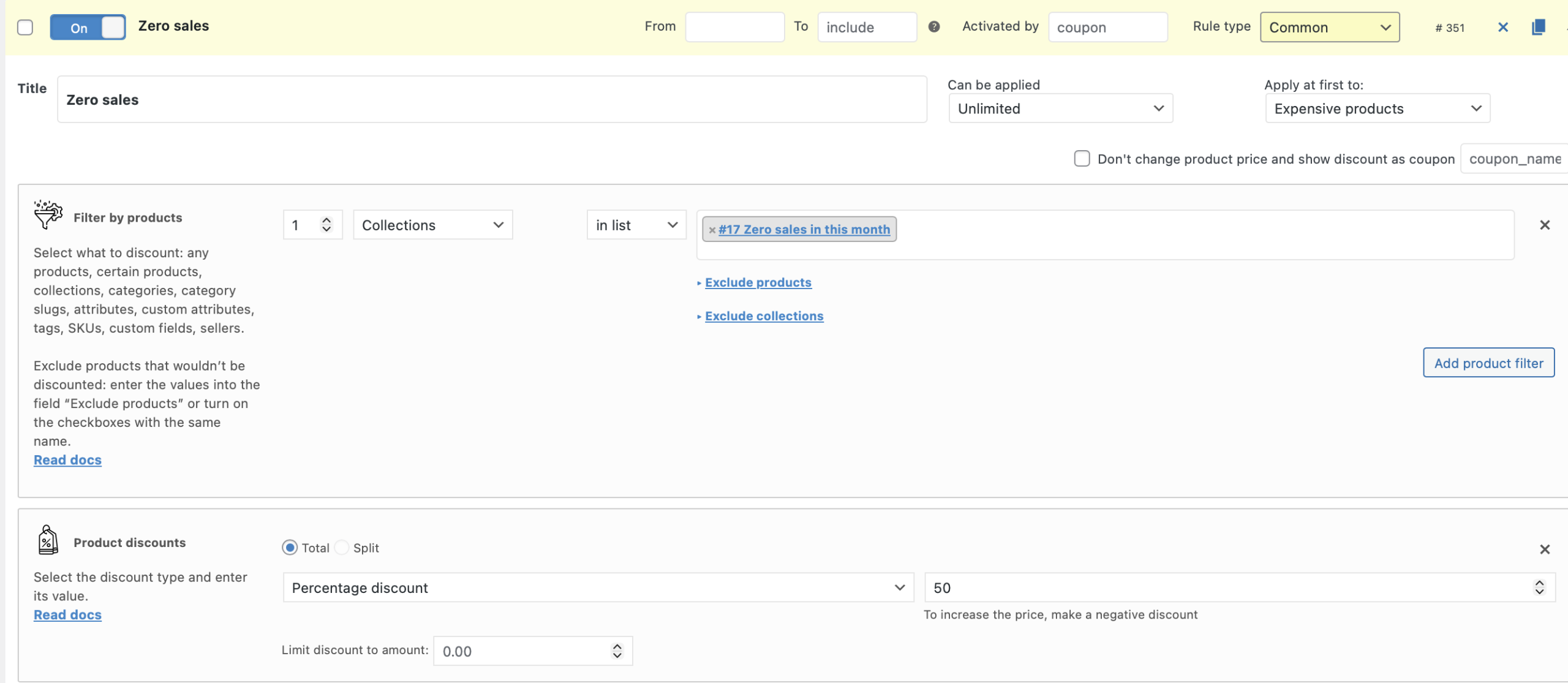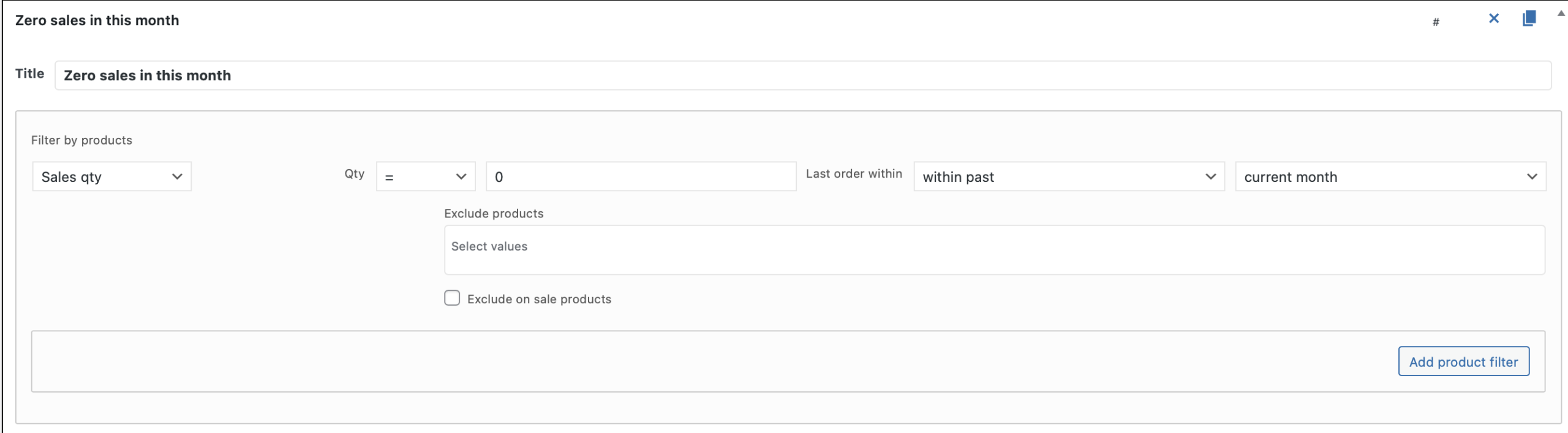 If you want to make a discount for the products that haven’t been sold at the last time, use the Product Collection’s filter “Sales qty”.