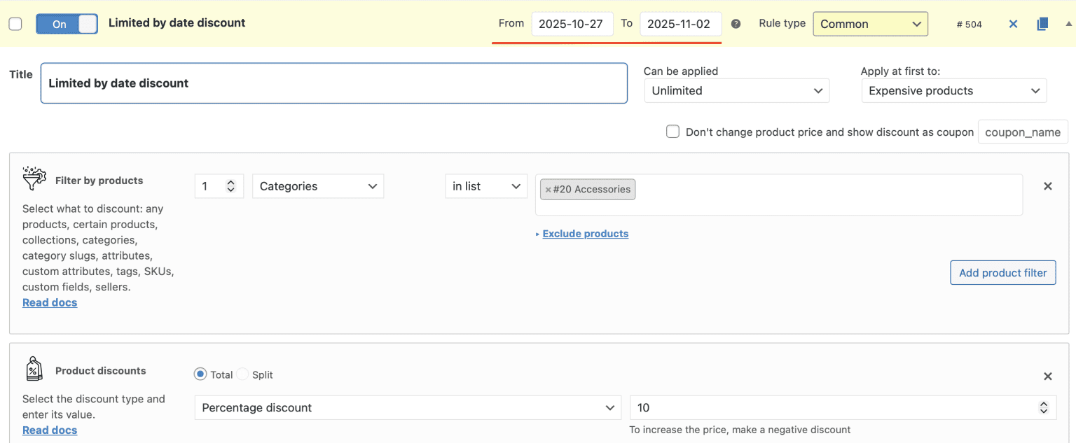 Enter the date range when the rule should be applied to the products and it’ll disable automatically on the end date.