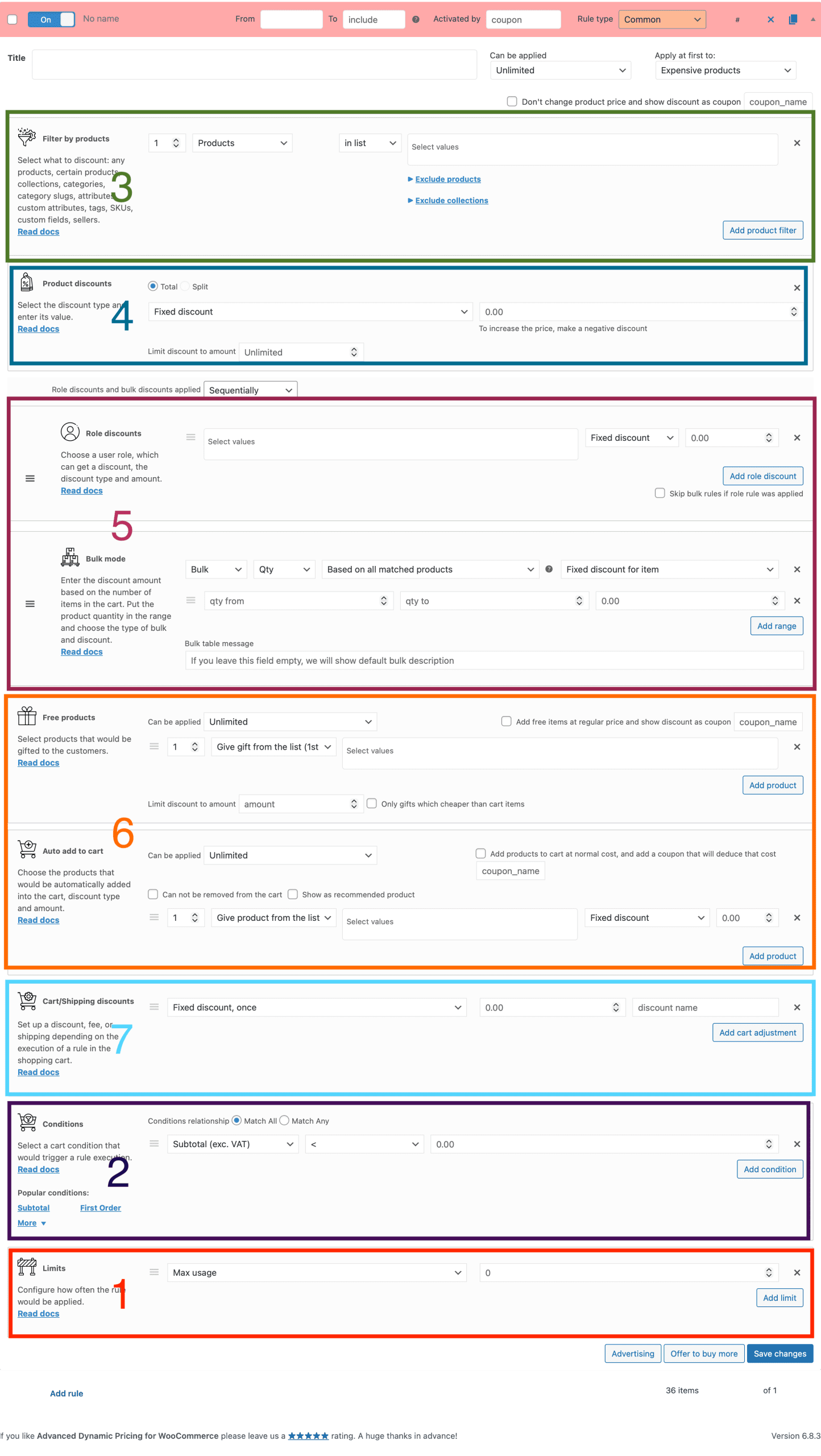 First of all, the Limits are checked. If the condition of the Limits hasn’t been met, the rule won’t be applied on the products.